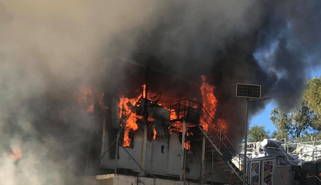 Ο συντονιστής των Γιατρών του Κόσμου, περιγράφει πως τα κοντέινερ στα οποία εξαπλώθηκε η πυρκαγιά έχουν καταστραφεί ολοσχερώς.