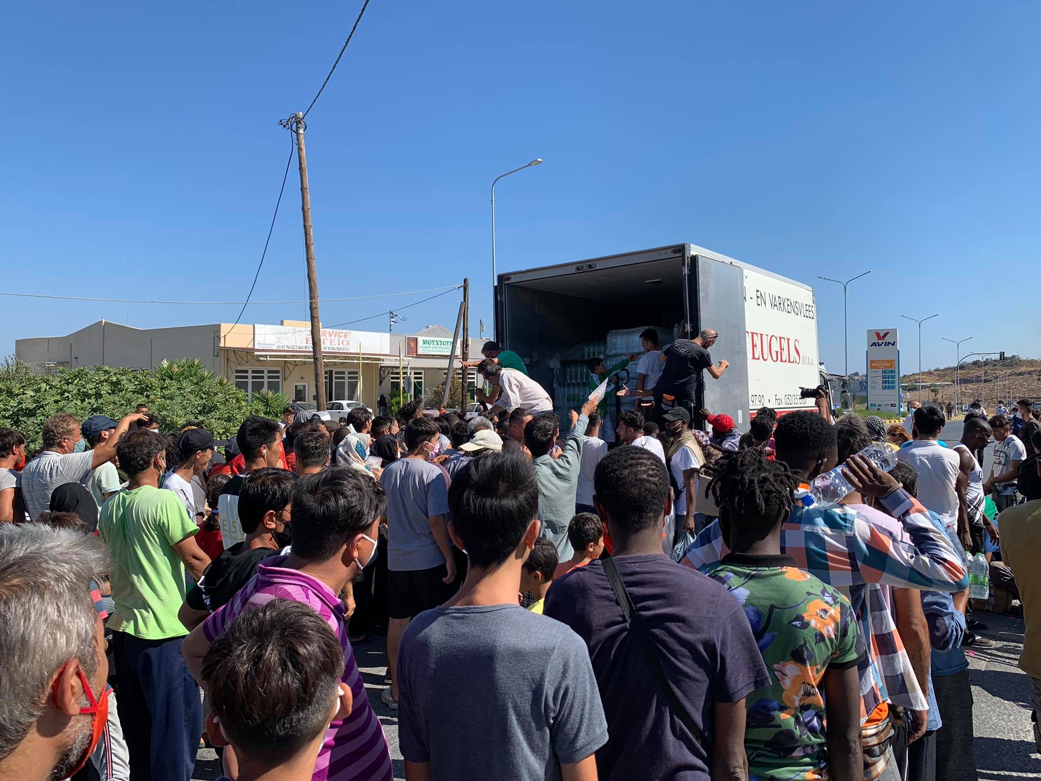 Στην ουρά για ένα μπουκάλι νερό και για φαγητό στήνονται μετανάστες και πρόσφυγες που εδώ και τρεις ημέρες πλέον ζουν στους δρόμους γύρω από τη Μόρια. Αποστολή του NEWS 24/7 στη Λέσβο.