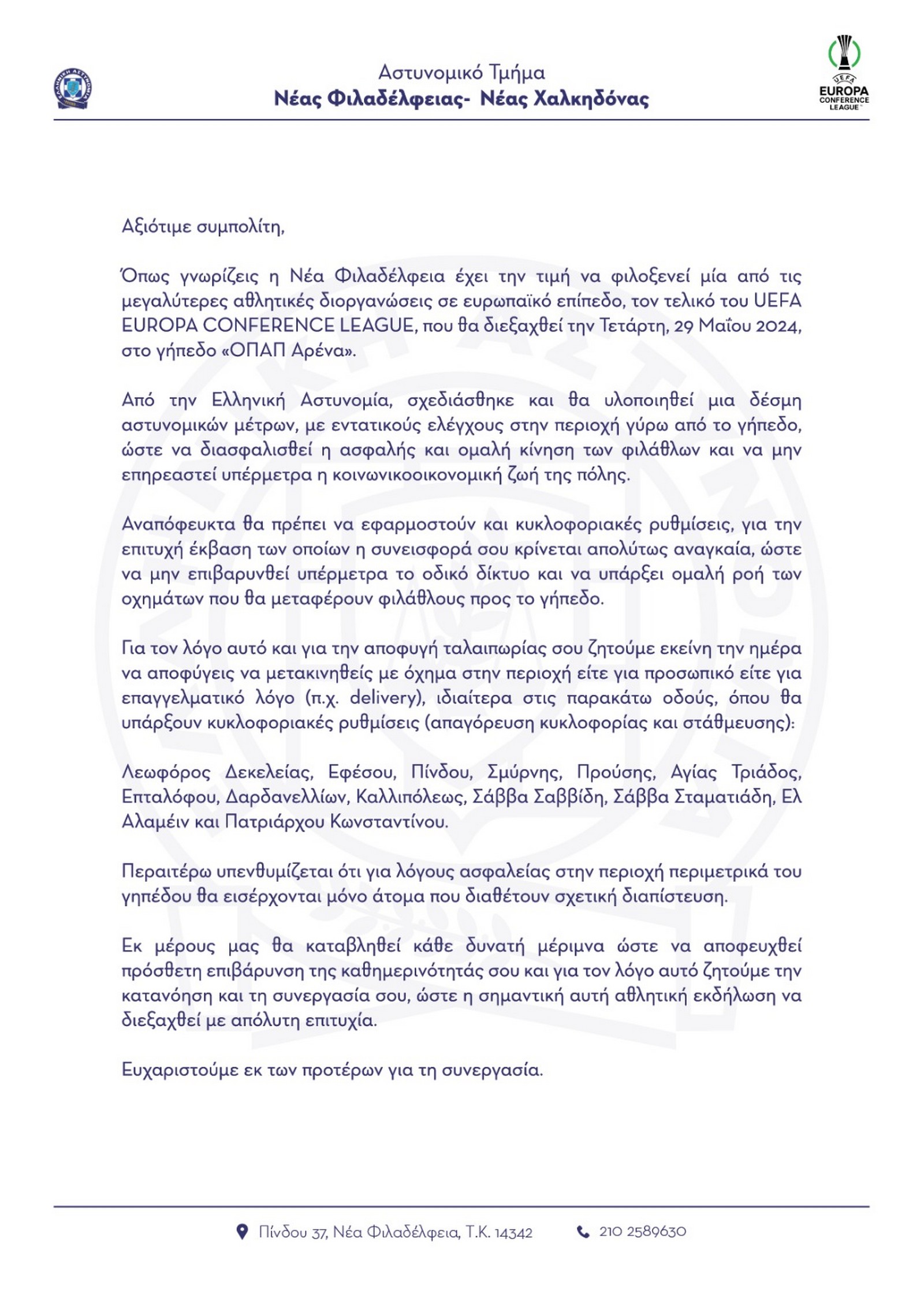 Η Ελληνική Αστυνομία, ενόψει του τελικού Uefa Europa Conference Leauge μεταξύ των ομάδων «Ολυμπιακός-Φιορεντίνα», που θα διεξαχθεί την Τετάρτη, 29 Μαΐου 2024, στο Γήπεδο «ΟΠΑΠ Αρένα» στη Νέα Φιλαδέλφεια, ενημερώνει τους πολίτες που διαμένουν στην περιοχή σχετικά με τα μέτρα ασφαλείας και τις κυκλοφοριακές ρυθμίσεις που θα τεθούν σε ισχύ.