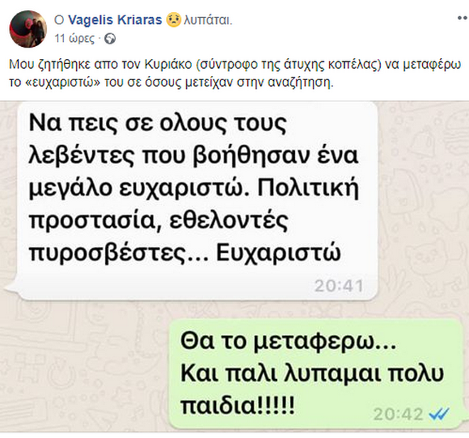Ο διασώστης Βαγγέλης Κριαράς, με ανάρτησή του στο facebook, δημοσίευσε το μήνυμα του 38χρονου Κύπριου, ο οποίος είναι ακόμη σοκαρισμένος από τον θάνατο της αγαπημένης του.