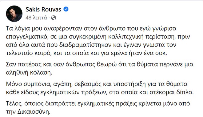 Νέα τοποθέτηση από τον Σάκη Ρουβά μετά την έκφραση της συμπόνιας του προς τον Λιγνάδη που προκάλεσε θύελλα αντιδράσεων. "Θεωρώ ότι τα θύματα περνάνε μια αληθινή κόλαση".