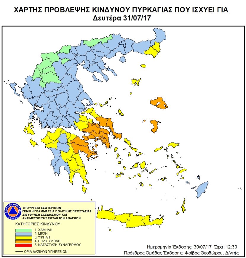 Σύμφωνα με το Χάρτη Πρόβλεψης Κινδύνου Πυρκαγιάς που εκδίδει η Γενική Γραμματεία Πολιτικής Προστασίας του Υπουργείου Εσωτερικών (www.civilprotection.gr), για αύριο Δευτέρα 31 Ιουλίου 2017, προβλέπεται πολύ υψηλός κίνδυνος πυρκαγιάς (κατηγορία κινδύνου 4) για τις εξής περιοχές: