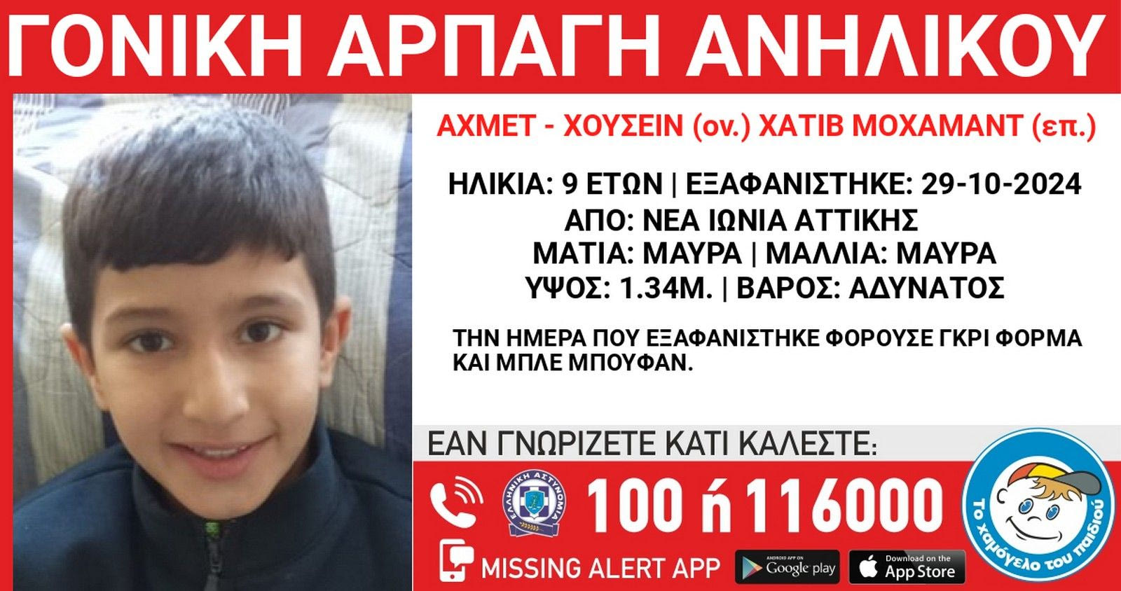 Η αναζήτηση του Αχμέτ-Χουσεΐν (ον.) Χατίβ Μοχάμαντ (επ.), 9 ετών, συνεχίζεται, καθώς ο ανήλικος δεν έχει εντοπιστεί ακόμα. Ωστόσο πραγματοποιείται λήξη του Αmber Αlert, λόγω πέρας του 48ωρου και της παράτασης αυτού.