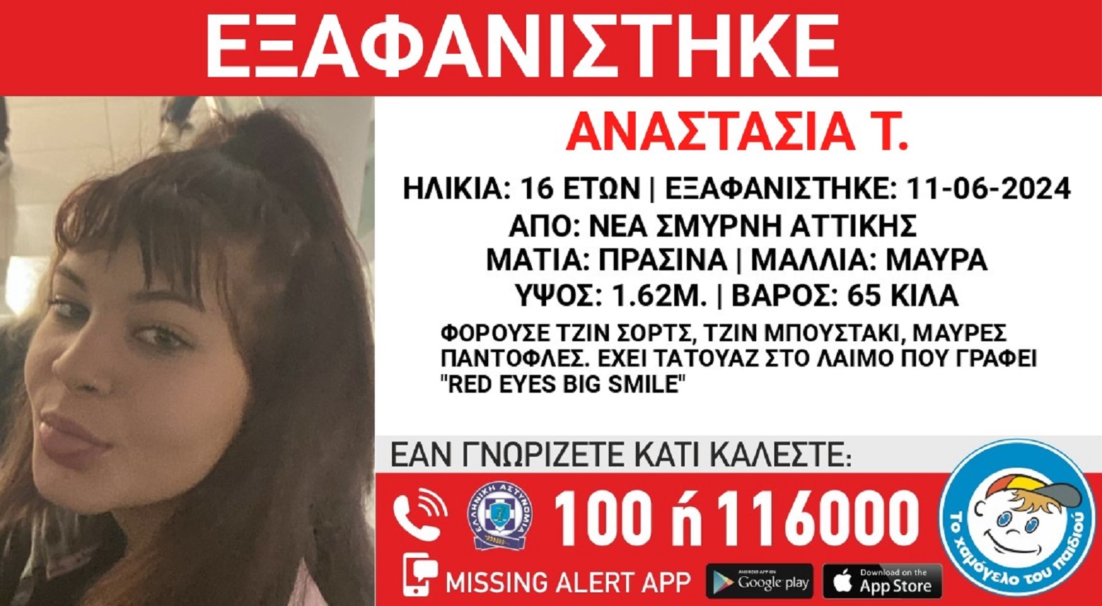 «Το Χαμόγελο του Παιδιού» ενημερώθηκε σήμερα 13/6/2024 και προχώρησε στη δημοσιοποίηση των στοιχείων της ανήλικης κατόπιν εισαγγελικής εντολής, καθώς συντρέχουν λόγοι που θέτουν τη ζωή της σε κίνδυνο.