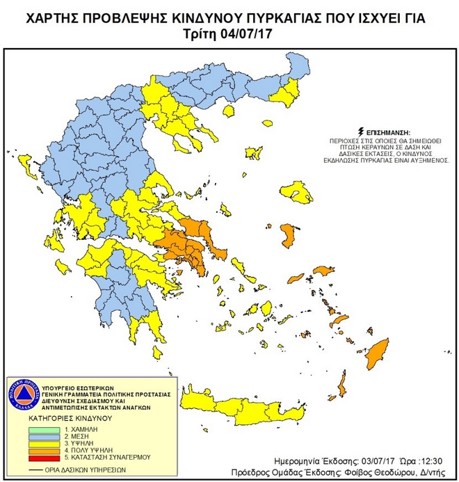 Σύμφωνα με το Χάρτη Πρόβλεψης Κινδύνου Πυρκαγιάς που εκδίδει η Γενική Γραμματεία Πολιτικής Προστασίας του Υπουργείου Εσωτερικών για αύριο, Τρίτη 4 Ιουλίου, προβλέπεται πολύ υψηλός κίνδυνος πυρκαγιάς (κατηγορία κινδύνου 4) για τις εξής περιοχές: