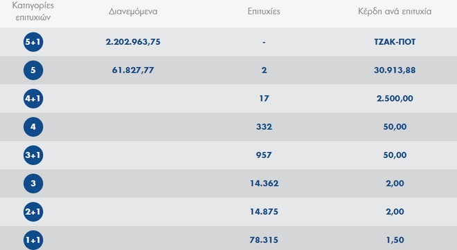 Οι τυχεροί αριθμοί είναι οι 1, 10, 26, 27, 42 και τζόκερ το 7. Στη δεύτερη κατηγορία (5 επιτυχίες) βρέθηκαν δύο τυχεροί, οι οποίοι θα πάρουν από σχεδόν 31.000 ευρώ.