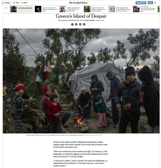 Το δημοσίευμα των NY Times για τους καταυλισμούς προσφύγων στη Λέσβο τιτλοφορείται "Το ελληνικό νησί της απελπισίας" New York Times