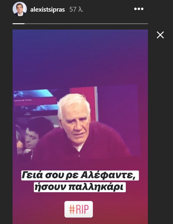 Μετά τον θάνατό του, ο Αλέξης Τσίπρας αφιέρωσε ένα instagram story στη μνήμη του, ενθυμούμενος το παραπάνω κάλεσμα του Αλέφαντου για debate.