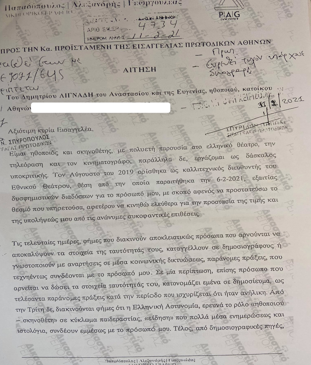 Ντοκουμέντο: Η αίτηση Λιγνάδη να εξεταστεί από την εισαγγελία προτού καταστεί κατηγορούμενος