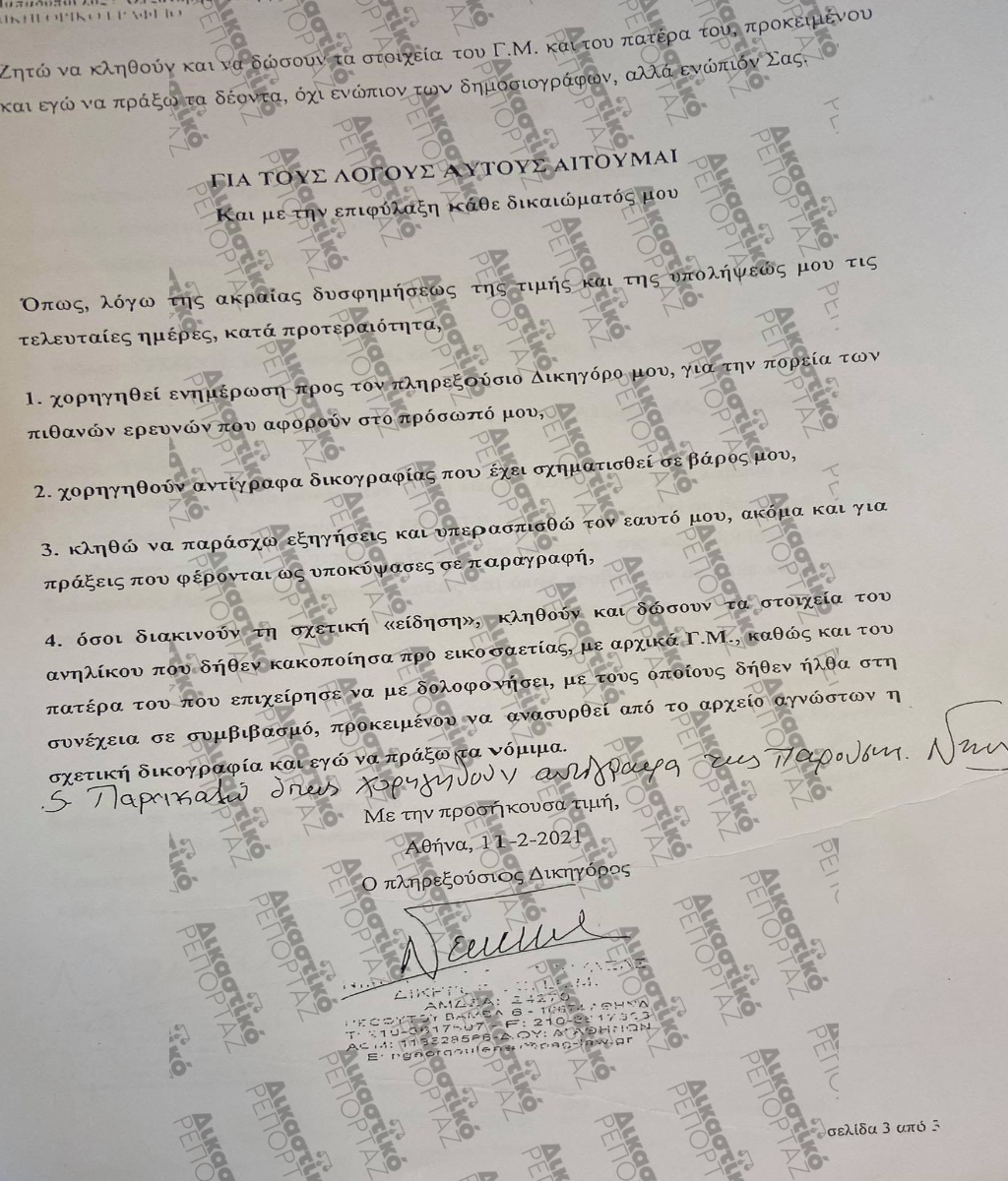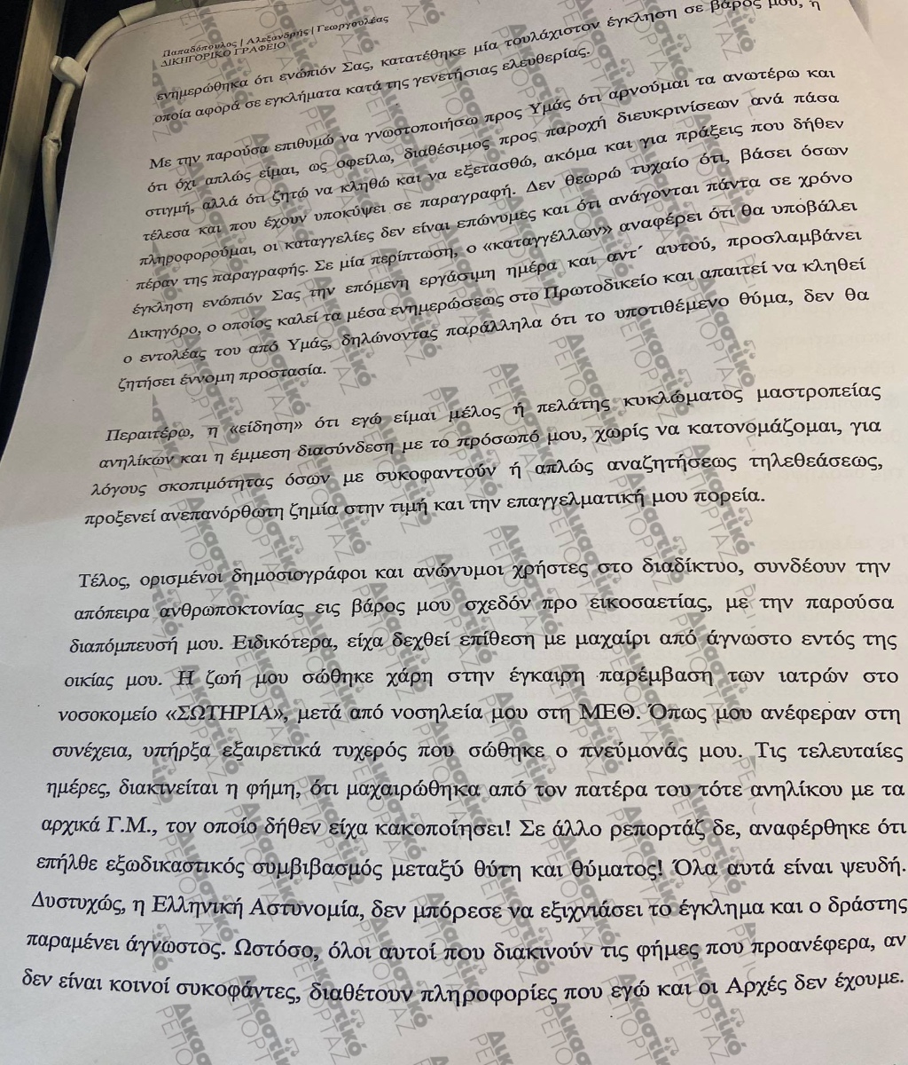 Το έγγραφο με το αίτημα του Δημήτρη Λιγνάδη να εξεταστεί από τις αρχές όταν υπάρξουν επώνυμες καταγγελίες σε βάρος του