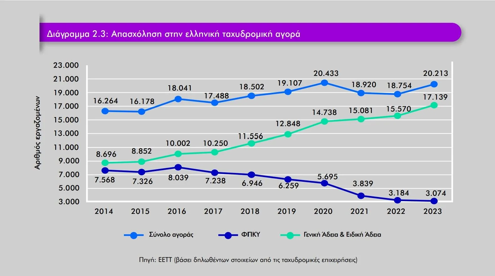Στην ετήσια επισκόπηση αναφέρεται χαρακτηριστικά: «Η άνοδος των πωλήσεων μέσω ηλεκτρονικού εμπορίου επηρέασε θετικά τη χρήση υπηρεσιών διανομής, με αποτέλεσμα οι επιχειρήσεις- κάτοχοι Γενικής Άδειας να παρουσιάσουν βελτίωση 11% του κύκλου εργασιών σε σύγκριση με το προηγούμενο έτος. Αντίθετα, ο κύκλος εργασιών του ΦΠΚΥ παρουσίασε πτώση 8% σε σύγκριση με το 2020 […] Το μερίδιο εσόδων του Φορέα Παροχής Καθολικής Υπηρεσίας (ΦΠΚΥ) στη συνολική αγορά ακολουθεί μία σταθερά πτωτική πορεία την τελευταία δεκαετία, με αποτέλεσμα να μειωθεί στο 21% από 25% που ήταν το 2020, ενώ παράλληλα, αυξήθηκε το μερίδιο των επιχειρήσεων ταχυμεταφορών στο 76% από 72% που ήταν την προηγούμενη χρονιά».