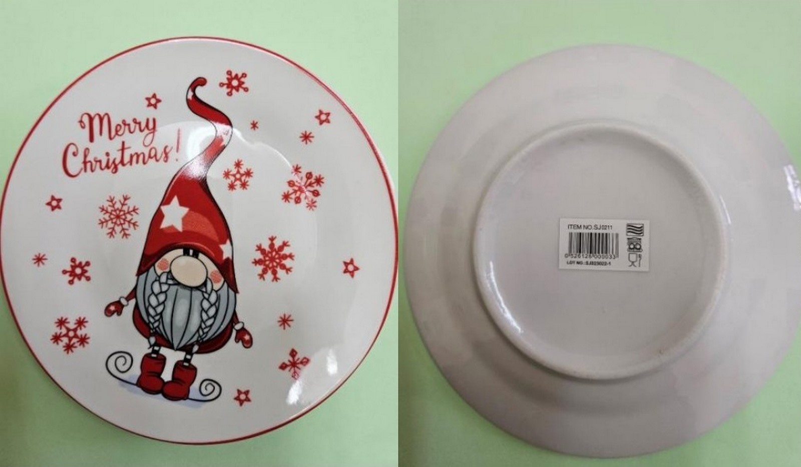 Πιάτο από πορσελάνη με χριστουγεννιάτικη διακόσμηση, προέλευσης Κίνας, στο οποίο διαπιστώθηκαν αυξημένα επίπεδα απελευθέρωσης καδμίου, ανακαλεί από την αγορά ο Ενιαίος Φορέας Ελέγχου Τροφίμων (ΕΦΕΤ).