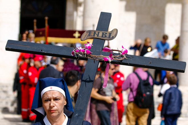 Στιγμιότυπο από την περιφορά του Επιταφίου στην μονή Καισαριανής,που γίνεται το μεσημέρι της Μεγάλης Παρασκευής. Εκεί τα λουλούδια του επιταφίου,συναγωνίζονται με τα λουλούδια της φύσης,καθώς η περιφορά γίνεται γύρω από το μοναστήρι,στο αισθητικό δάσος Καισαριανής.
