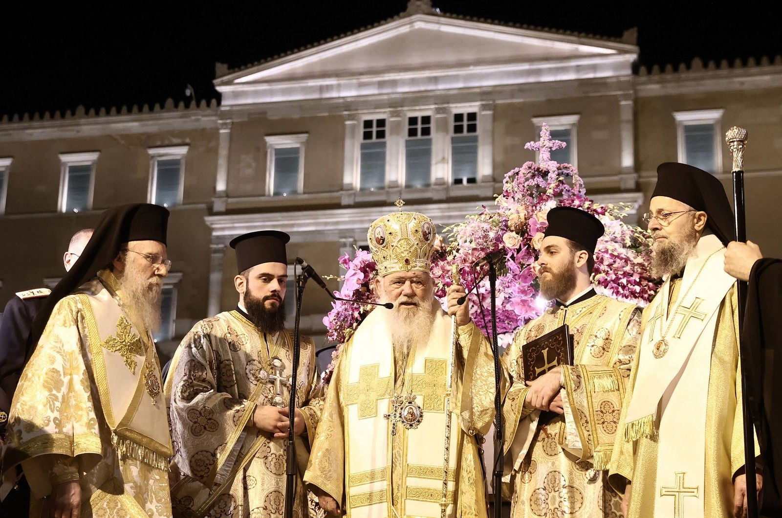 Από την Πλατεία Συντάγματος, ο Προκαθήμενος της Ελλαδικής Εκκλησίας τόνισε: «Ευσεβείς άρχοντές μας, ευλαβέστατε λαέ του Κυρίου, μέσα σε αυτή την κατανυκτική ατμόσφαιρα, ενώπιον τόσων ανθρώπων που θρησκεύουν, που αγαπούν την Εκκλησία μας και την πατρίδα μας, αισθάνομαι την ανάγκη μέσα από την καρδιά μου, σαν πνευματικός σας πατέρας, να ευχηθώ σε όλους καλή δύναμη, καλό Πάσχα, καλή φώτιση -φώτιση που ιδιαίτερα χρειαζόμαστε τον καιρό ή τις ημέρες αυτές. Όπου κι αν στρέψουμε τα μάτια μας, τη σκέψη μας , τον λογισμό μας, πάντοτε γυρίζουμε στον εαυτό μας σκεφτικοί, «άραγε τι θα μας βρει αύριο; Αύριο προς τα πού πηγαίνουμε; ‘Αραγε τι σημαίνουν όλα αυτά που διαβάζουμε και τα βλέπουμε στις γειτονιές μας;». Ανησυχούμε. Ας ευχηθούμε, λοιπόν, σήμερα μέσα σε αυτήν τη θρησκευτική ατμόσφαιρα, μέσα στην κατανυκτική ατμόσφαιρα, ο Θεός να φωτίσει όλους μας, τον καθένα χωριστά, ιδιαίτερα τους άρχοντές μας, τους επικεφαλής, εκείνους οι οποίοι μπορούν, προσπαθούν και αγωνίζονται για κάτι καλύτερο. Η βραδιά απόψε και η ατμόσφαιρα και ό,τι ζήσαμε μέσα στην εκκλησία μάς δίνουν κουράγιο, μας δίνουν δύναμη, γιατί και άλλοτε περάσαμε δύσκολες ώρες και τα καταφέραμε και προχωρήσαμε. Και τώρα να παρακαλέσουμε όλοι μέσα από την καρδιά μας, άρχοντες και λαός, μικροί και μεγάλοι, Κύριε, βοήθησέ μας, το χρειαζόμαστε».