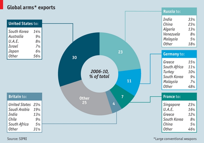 Παρατηρήθηκε μάλιστα σημαντική αύξηση του αριθμού εξαγωγών κατά 25% σε σύγκριση με την περίοδο 2001-2005. Να σημειωθεί, τέλος, πως το Διεθνές Ινστιτούτο Ερευνών για την Ειρήνη υπολογίζει τις παραδόσεις μεγάλων συμβατικών όπλων σε καθένα εκ των οποίων αποδίδεται τιμή, στρατηγική σημασία και άλλα κριτήρια.