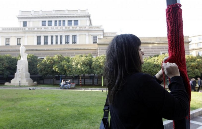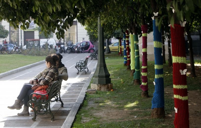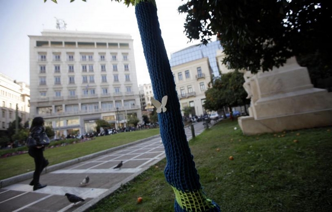 Τα δέντρα και τα παγκάκια στο ύψος της παλιάς Βουλής, στην οδό Σταδίου στην Αθήνα, ντύθηκαν με “πλεκτά πουλόβερ”, στα πλαίσια της εικαστικής δράσης που φέρει το όνομα “Yarn Bombing”.