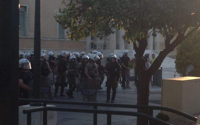 Η πορεία έφτασε στο φραγμό των ΜΑΤ, όπου εκτοξεύθηκαν πέτρες και δυο μολότοφ. Οι αστυνομικές δυνάμεις απάντησαν με χρήση χημικών.