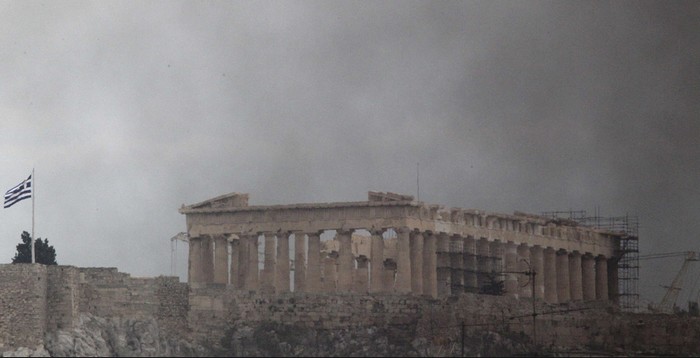 Καπνοί ζώνουν τον Παρθενώνα. Αποπνικτική ατμόσφαιρα λόγω της χρήσης χημικών και δακρυγόνων στην Αθήνα. (Φωτογραφία: Pascal Rossignol για το Reuters).
