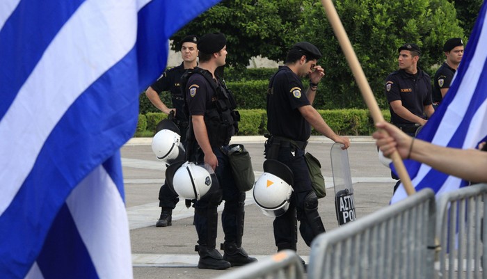 Πολίτες μουτζώνουν προς το ελληνικό κοινοβούλιο, υπό το βλέμμα ισχυρής αστυνομικής δύναμης. (Φωτογραφία: Γιώργος Καραχάλης για το Reuters).