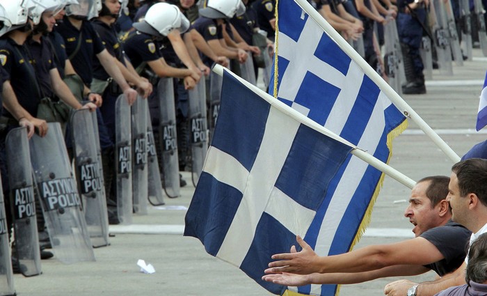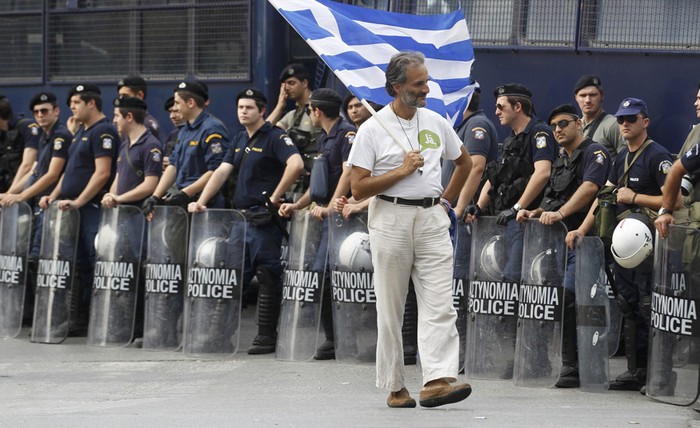 Διαδηλωτής που κρατά την ελληνική σημαία περνά μπροστά από παράταξη αστυνομικών. (Φωτογραφία: Γιώργος Καραχάλης για το Reuters).