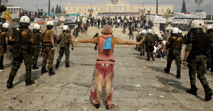 Διαδηλώτρια απλώνει τα χέρια της στους αστυνομικούς, την ώρα που στο Σύνταγμα βρίσκονται σε εξέλιξη βίαιες συγκρούσεις. (Φωτογραφία: Γιώργος Καραχάλης για το Reuters).