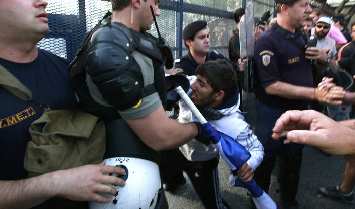 Ένταση μεταξύ διαδηλωτή και αστυνομικών μπροστά στο σιδηρόφρακτο “τείχος” που στήθηκε στη Βασ. Σοφίας. (Φωτογραφία: Γιάννης Μπεχράκης για το Reuters).