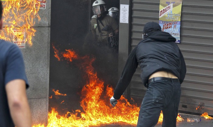 Πεδίο μάχης η Αθήνα. Φλόγες στους δρόμους. (Φωτογραφία: Γιάννης Μπεχράκης για το Reuters).