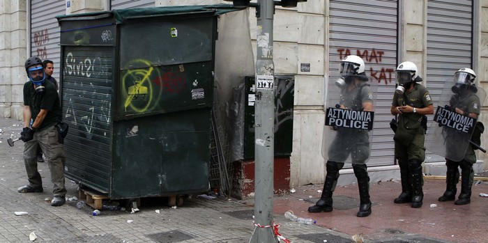Διαδηλωτής μπροστά σε αστυνομικούς κοντά στο ελληνικό κοινοβούλιο. (Φωτογραφία: Pascal Rossignol για το Reuters).