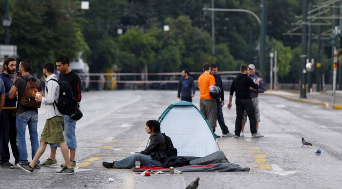 Διαδηλωτές κατασκηνώνουν έξω από το ελληνικό κοινοβούλιο. (Φωτογραφία: Γιάννης Μπεχράκης για το Reuters).