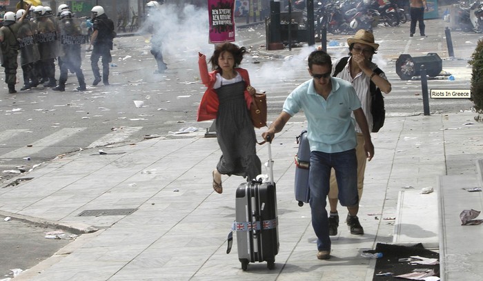 Τουρίστες προσπαθούν να απομακρυνθούν, την ώρα που στο κέντρο της Αθήνας σημειώνονται εκτεταμένα επεισόδια. (Φωτογραφία: Γιάννης Κολεσίδης για το Reuters).