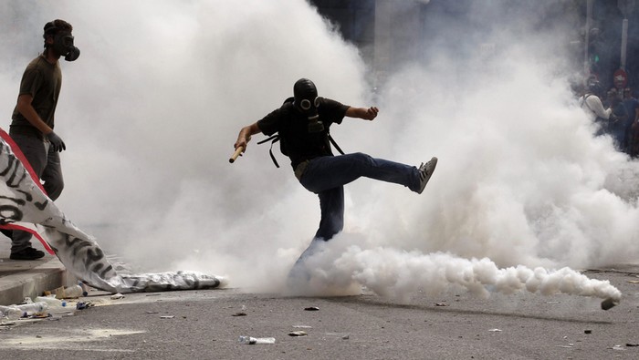 Κουκολοφόροι και χημικά στο κέντρο της Αθήνας. (Φωτογραφία: Γιώργος Καραχάλης για το Reuters).