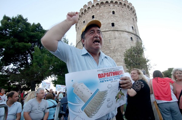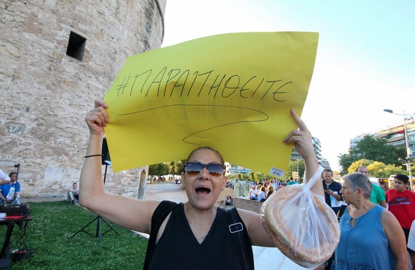 Διαδηλωτές συγκεντρώθηκαν στο Λευκό Πύργο με πλακάτ στα χέρια με κεντρικό σύνθημα το «Παραιτηθείτε» και με τη φράση «ούτε κόμματα, ούτε χρώματα, ούτε συνδικάτα, πολίτες μόνο». Έστησαν μικροφωνική στο πλακόστρωτο μπροστά στο Λευκό Πύργο, μετέδωσαν μουσική και φώναζαν συνθήματα με τα οποία καλούν σε παραίτηση την κυβέρνηση, στην οποία βγάζουν συμβολικά «κόκκινη κάρτα», ενώ κατά διαστήματα διαβάζονται αποσπάσματα με τα αιτήματα της πρωτοβουλίας.