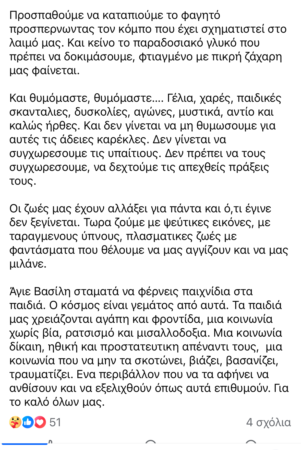 Άγιε Βασίλη σταματά να φέρνεις παιχνίδια στα παιδιά. Ο κόσμος είναι γεμάτος από αυτά. Τα παιδιά μας χρειάζονται αγάπη και φροντίδα, μια κοινωνία χωρίς βία, ρατσισμό και μισαλλοδοξία. Μια κοινωνία δίκαιη, ηθική και προστατευτική απέναντι τους, μια κοινωνία που να μην τα σκοτώνει, βιάζει, βασανίζει, τραυματίζει. Ένα περιβάλλον που να τα αφήνει να ανθίσουν και να εξελιχθούν όπως αυτά επιθυμούν. Για το καλό όλων μας”.