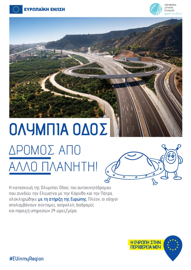 Με μια καμπάνια που ξεκινά στις 7 Οκτωβρίου και θα διαρκέσει ένα μήνα, Έλληνες και ξένοι και, ειδικά, οι κάτοικοι της Περιφέρειας Δυτικής Ελλάδας θα ενημερωθούν και επίσημα για την ολοκλήρωση της Ολυμπίας Οδού, ενός ιδιαίτερα σημαντικού οδικού άξονα, που συνδέει την Δυτική Ελλάδα και την Πελοπόννησο (Ελευσίνα-Κόρινθο-Πάτρα) όχι μόνο με την υπόλοιπη χώρα μας, αλλά και με την Ευρώπη. Ο στρατηγικής σημασίας υπερσύγχρονος αυτός αυτοκινητόδρομος συνολικού μήκους 202χλμ., αναμένεται να συμβάλει αποφασιστικά στην ανάπτυξη του τουρισμού των περιοχών αυτών και την προβολή προορισμών όπως τα ιστορικά Καλάβρυτα, μια ιστορική πόλη γνωστή, μεταξύ άλλων, και για το κοσμοπολίτικο χιονοδρομικό κέντρο της.