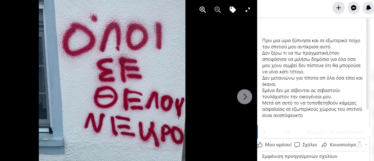 “Πριν μια ώρα ξύπνησα και σε εξωτερικό τοίχο του σπιτιού μου αντίκρισα αυτό. Δεν ξέρω τι να πω πραγματικά, όταν αποφάσισα να μιλήσω δημόσια για όλα όσα μου χουν συμβεί δεν πίστευα ότι θα μπορούσε να γίνει κάτι τέτοιο. Δεν μετανιώνω για τίποτα απ όλα όσα είπα και έκανα. Εμένα δεν με σέβονται ας σεβαστούν τουλάχιστον την οικογένεια μου. Μετά απ αυτό το να τοποθετηθούν κάμερες ασφαλείας σε εξωτερικούς χώρους του σπιτιού είναι αναπόφευκτο”, έγραψε ο νεαρός στο Facebook.
