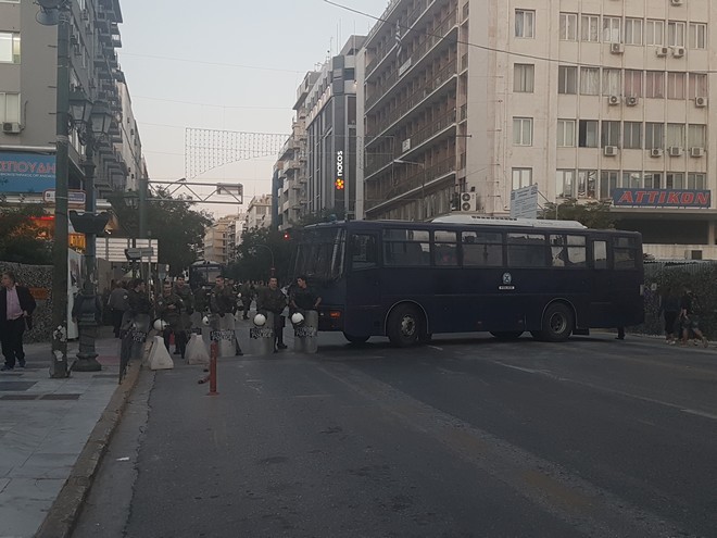 Γύρω από το σημείο που βρίσκονται τα γραφεία της Χρυσής Αυγής είχαν σπεύσει από νωρίς ισχυρές δυνάμεις των ΜΑΤ, ενώ κάτω από το κτίριο βρισκόταν ήδη ο βουλευτής Ηλίας Κασιδιάρης, ο Σωτήρης Δεβελέκος και άλλα μέλη της οργάνωσης. Λίγο μετά τις 18:30 τα ΜΑΤ απέκλεισαν την Ηρώων Πολυτεχνείου που περνάει μπροστά από τα γραφεία της οργάνωσης.
