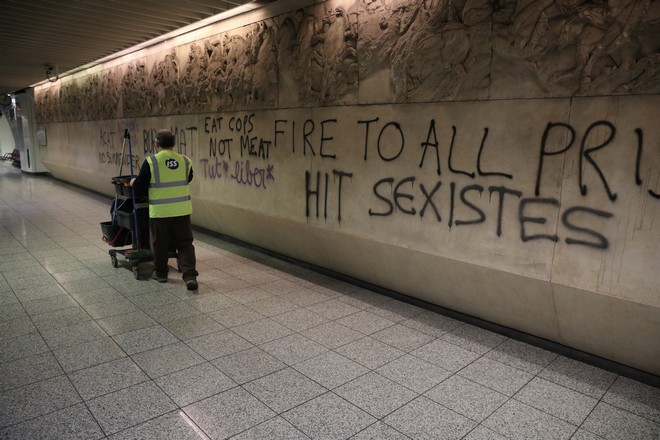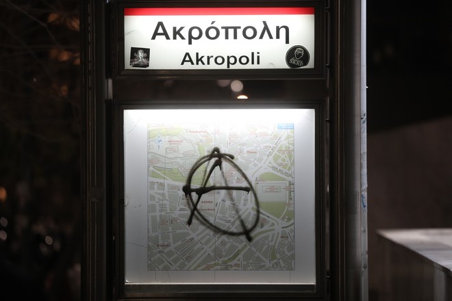 Περίπου 60 άτομα με κουκούλες εισέβαλαν το βράδυ της Τετάρτης στον σταθμό του Μετρό της Ακρόπολης. Πέταξαν μπογιές και έγραψαν συνθήματα.