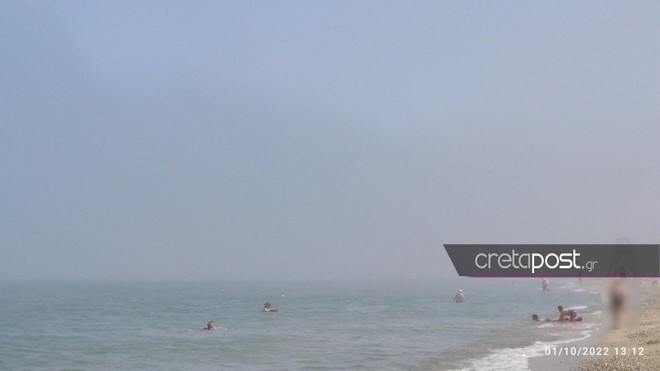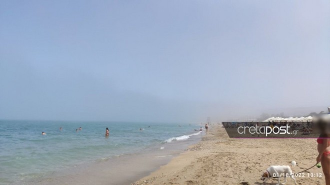 *Στις φωτογραφίες του cretapost διακρίνεται η παραλία του Καρτερού από όπου στο βάθος και κοιτώντας προς τη δύση οι λουόμενοι βλέπουν ξεκάθαρα τον αεροδιάδρομο του «Ν.Καζαντζάκης» και τα αεροπλάνα που προσγειώνονται. Αυτά όμως υπό ομαλές μετεωρολογικές συνθήκες. Σήμερα η ομίχλη μεταφοράς σκέπασε κυριολεκτικά τα πάντα.