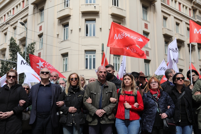 Στην πορεία ήταν και ο γ.γ. του ΜέΡΑ25, Γιάνης Βαρουφάκης, λίγες ημέρες μετά τον ξυλοδαρμό του στα Εξάρχεια.