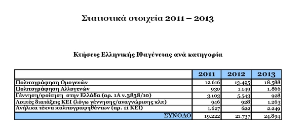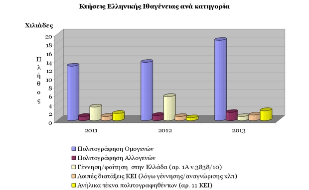 Κατά τη διάρκεια των ετών 2011 – 2013, συνολικά 65.853 άνθρωποι απέκτησαν την ελληνική ιθαγένεια. Δείτε πόσοι απέκτησαν την ιθαγένεια ανά κατηγορία, σύμφωνα με τα στοιχεία του Υπουργείου Εσωτερικών: