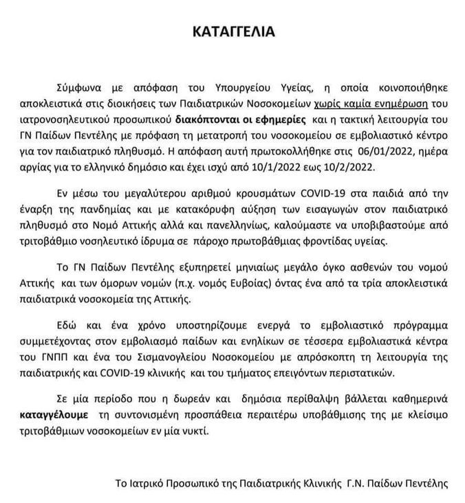 Στην καταγγελία ότι το Υπουργείο Υγείας προχώρησε στην απόφαση να διακόπτονται οι εφημερίες και η τακτική λειτουργία του ΓΝ Παίδων Πεντέλης για να μετατραπεί το νοσοκομείο σε αμιγώς εμβολιαστικό κέντρο προχώρησε το ιατρικό προσωπικό.
