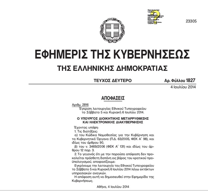 Εγκρίνουμε την λειτουργία του Εθνικού Τυπογραφείου το Σάββατο 5 και Κυριακή 6 Ιουλίου 2014 λόγω εκτάκτων υπηρεσιακών αναγκών.