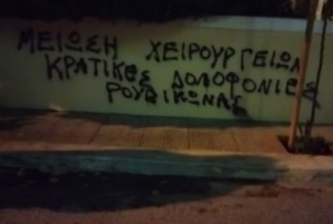Τα μέλη του “Ρουβίκωνα” έγραψαν στον εξωτερικό τοίχο του σπιτιού “μείωση κρατικών χειρουργείων. Κρατικές Δολοφονίες”.