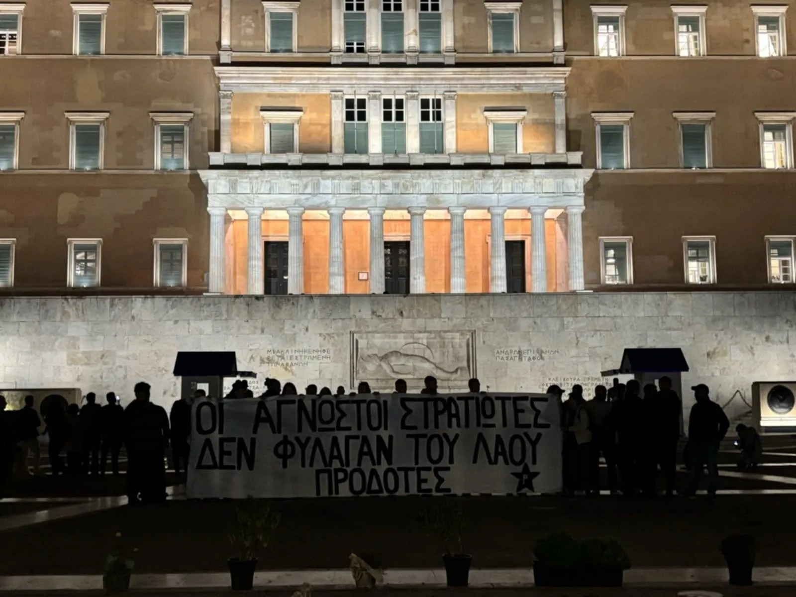 Το πανό που σήκωσαν μπροστά από το μνημείο έγραφε: “Οι άγνωστοι στρατιώτες δεν φύλαγαν του λαού προδότες”.