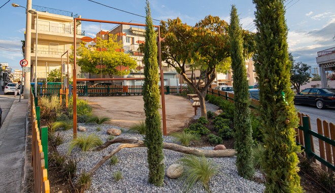 Ακόμα δύο αναξιοποίητοι χώροι, οι οποίοι, σε συνεργασία με τοπικούς φορείς και την Οργάνωση ΓΗ, μεταμορφώθηκαν, δίνοντας έναν πνεύμονα οξυγόνου στους κατοίκους της περιοχής, αλλά και δύο σημεία συνάντησης για παιδιά και μαθητές, αφού δεσπόζουν περήφανα, περιμένοντάς τους απέναντι από το παρακείμενο σχολείο.
