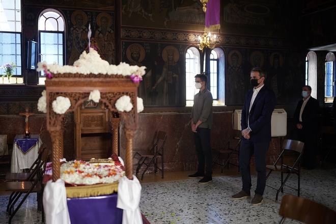 Ο πρωθυπουργός συνοδευόμενος από τον γιο του Κωνσταντίνο, παρακολούθησε την Ακολουθία του Επιταφίου στον Ιερό Ναό του Ευαγγελιστού Λουκά, παρεκκλήσιο του Γενικού Νοσοκομείου Αθηνών «Ιπποκράτειο».
