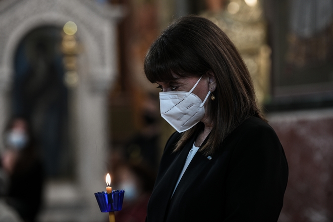 Η Πρόεδρος της Δημοκρατίας Κατερίνα Σακελλαροπούλου παρακολούθησε την Ακολουθία στην Ιερά Μητρόπολη Πειραιώς.