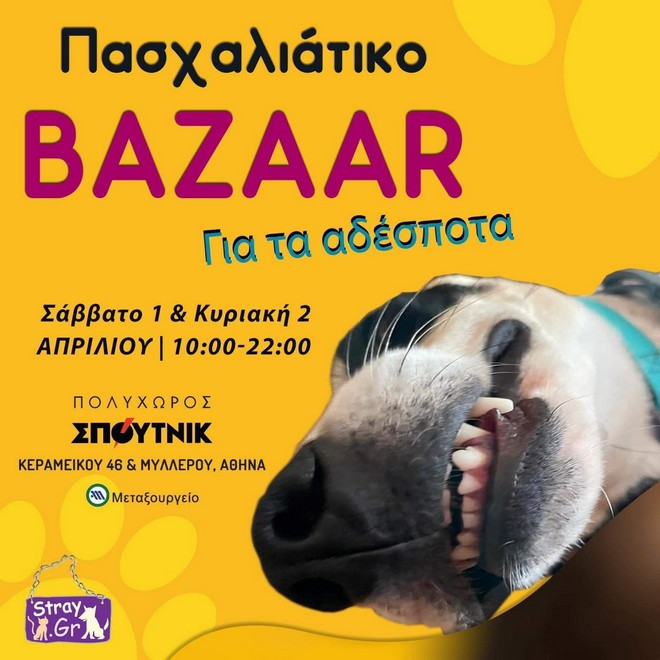 Το Σωματείο Περίθαλψης & Προστασίας Αδέσποτων Ζώων, stray.gr, διοργανώνει πασχαλιάτικο μπαζάρ οικονομικής ενίσχυσης στις 2 Απριλίου, στον πολυχώρο Σπούτνικ, με αφορμή την Παγκόσμια Ημέρα Αδέσποτων Ζώων στις 4 Απριλίου.