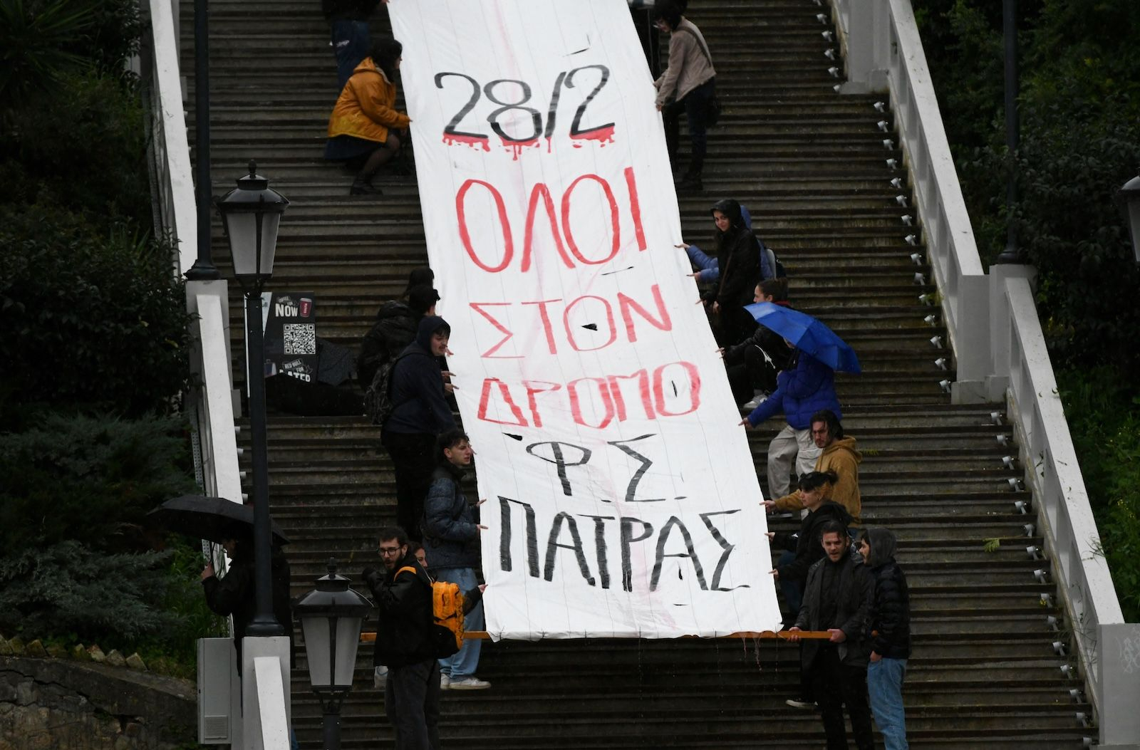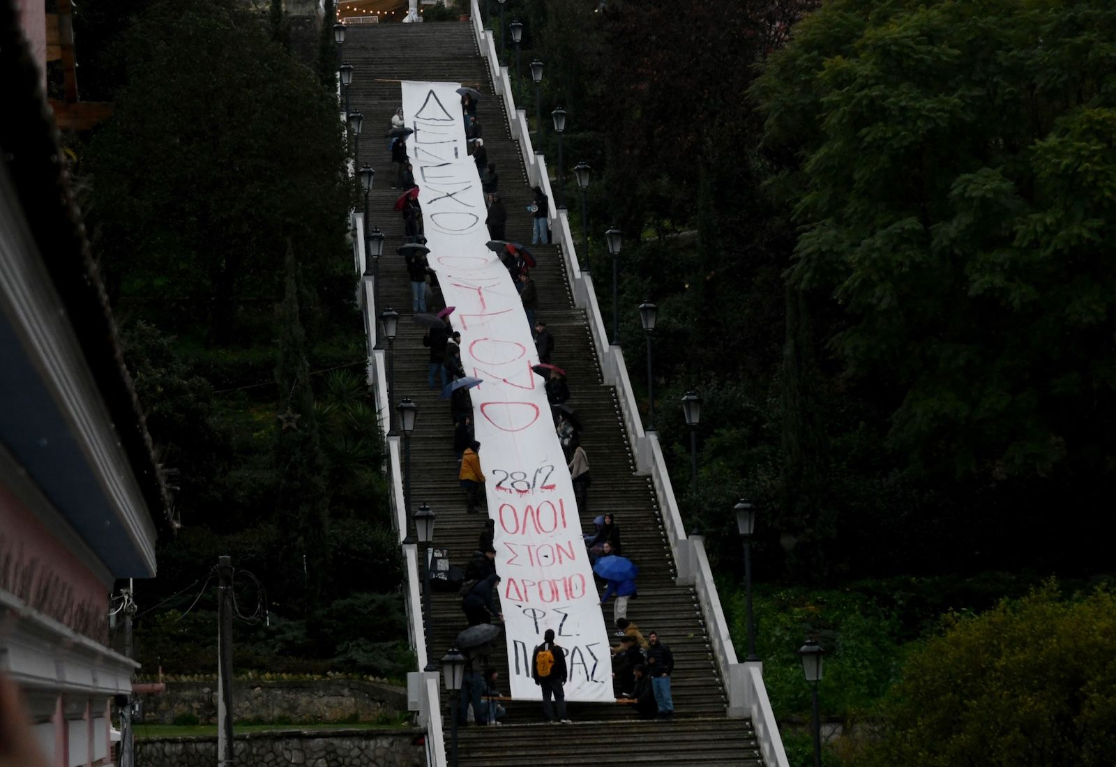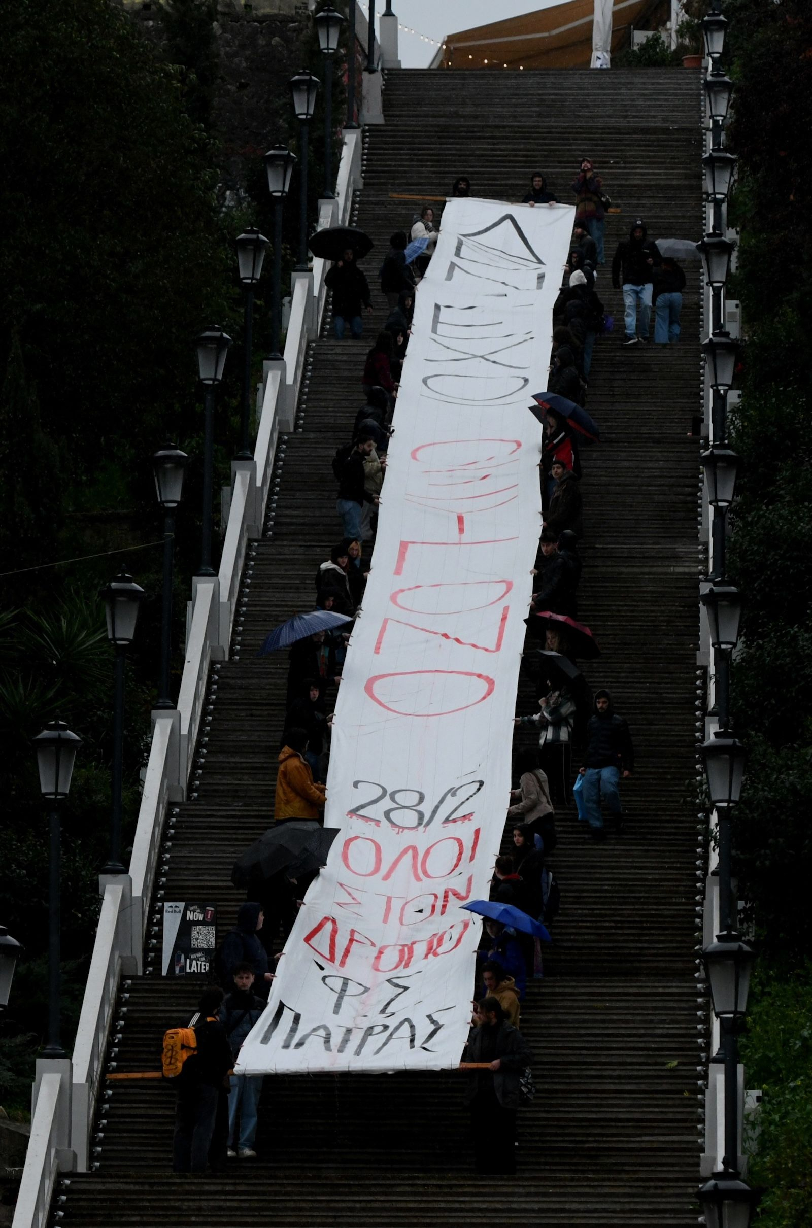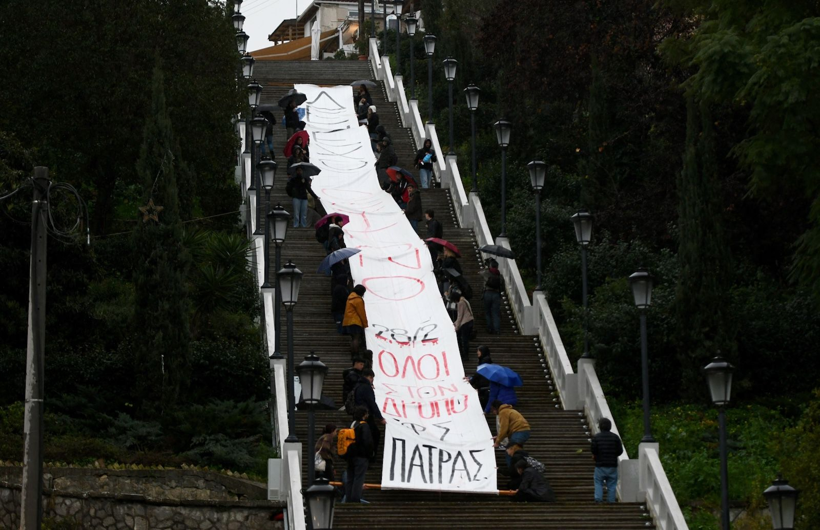 Φοιτητές στην Πάτρα ύψωσαν ένα γιγαντιαίο πανό στα σκαλιά του Αγίου Νικολάου για τα Τέμπη και απεύθυναν κάλεσμα για τις αυριανές απεργιακές κινητοποιήσεις.