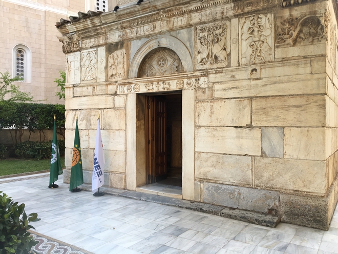Έξω από το παρεκκλήσι της Μητρόπολης βρίσκονται τρεις σημαίες. Του Παναθηναϊκού, της ΚΑΕ και της ΒΙΑΝΕΞ.